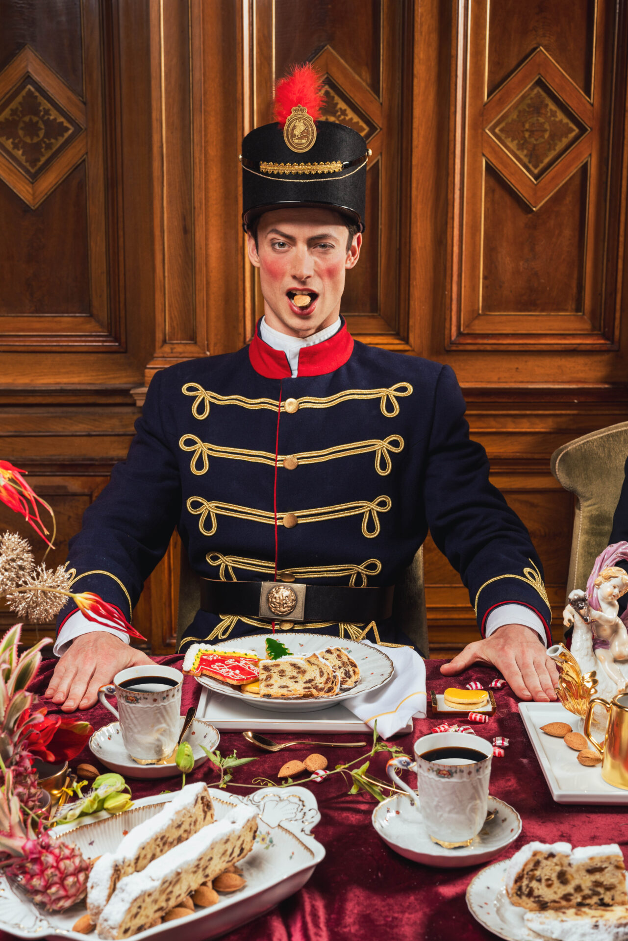 Two sets with daytime and nighttime sky backgrounds were constructed. It’s good to have enough space available and plenty of helping hands on hand. The Stollen Protective Association team was joined by photographers, a videographer, a costume and make-up artist, an art director, a concept designer, a set stylist, and master florist Björn Kroner-Salié. The Dresden stollen bakers also pitched in with great passion and