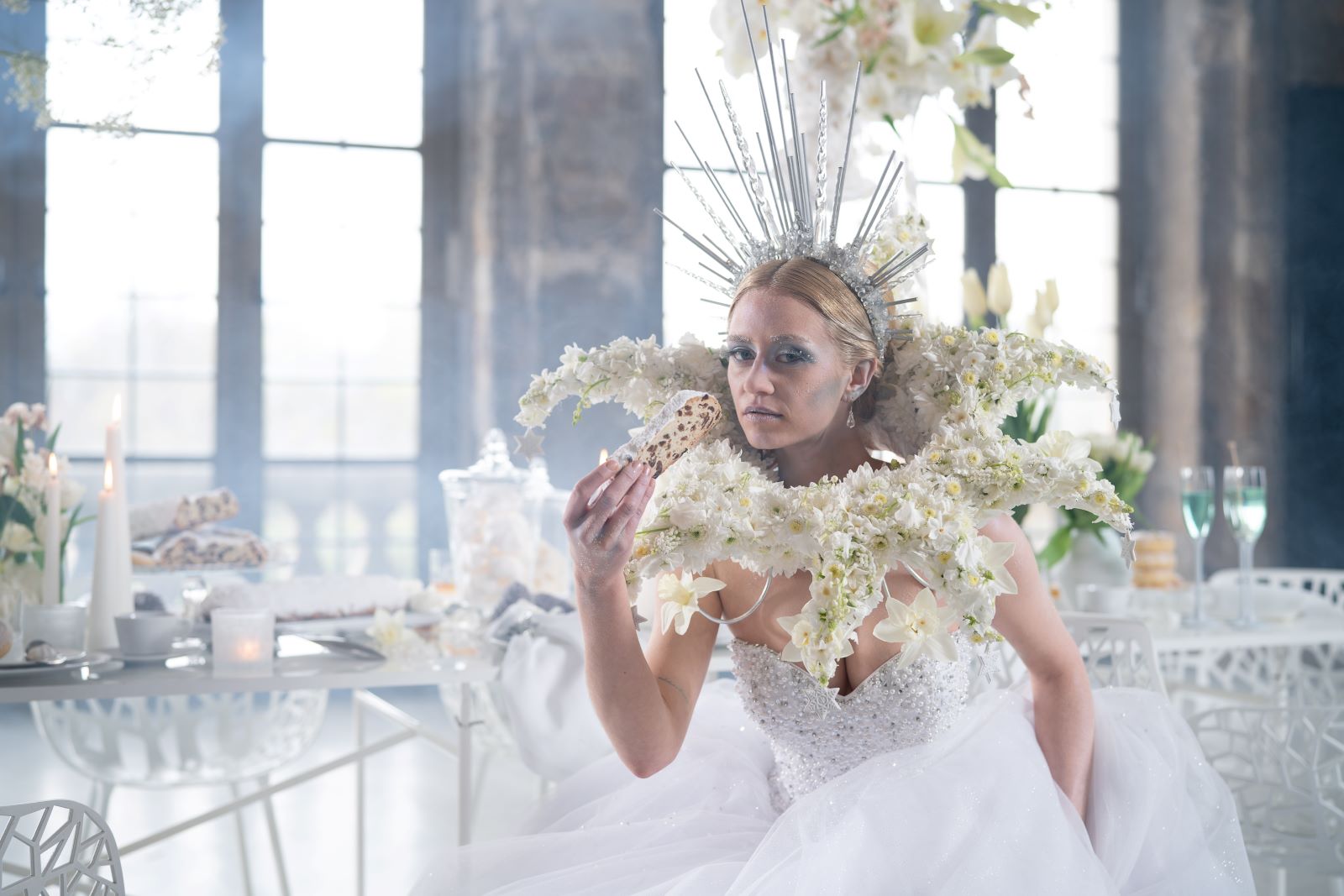 Studentin Johanna übernahm diese Rolle der eleganten Schönheit mit dem gefrorenen Herzen. Was konnte sie eisig in die Kamera blicken! Ihre Krone aus feinen „Eis“zapfen hatte Maskenbildnerin Fabienne Lunden für diesen Anlass extra angefertigt, das atemberaubende festliche Tüllkleid mit unzähligen Kristallen Hochzeits- und Festkleid-Couturier Uwe Herrmann, Weißes Gewölbe Dresden, bereitgestellt. Spektakulär der Halsschmuck: Ein irrer Kragen mit unzähligen weißen Blüten und fast soviel Sternen aus Meissener Porzellan; entworfen und gefertigt mit viel Fantasie und noch mehr Fleiß von Florist Björn Kroner.